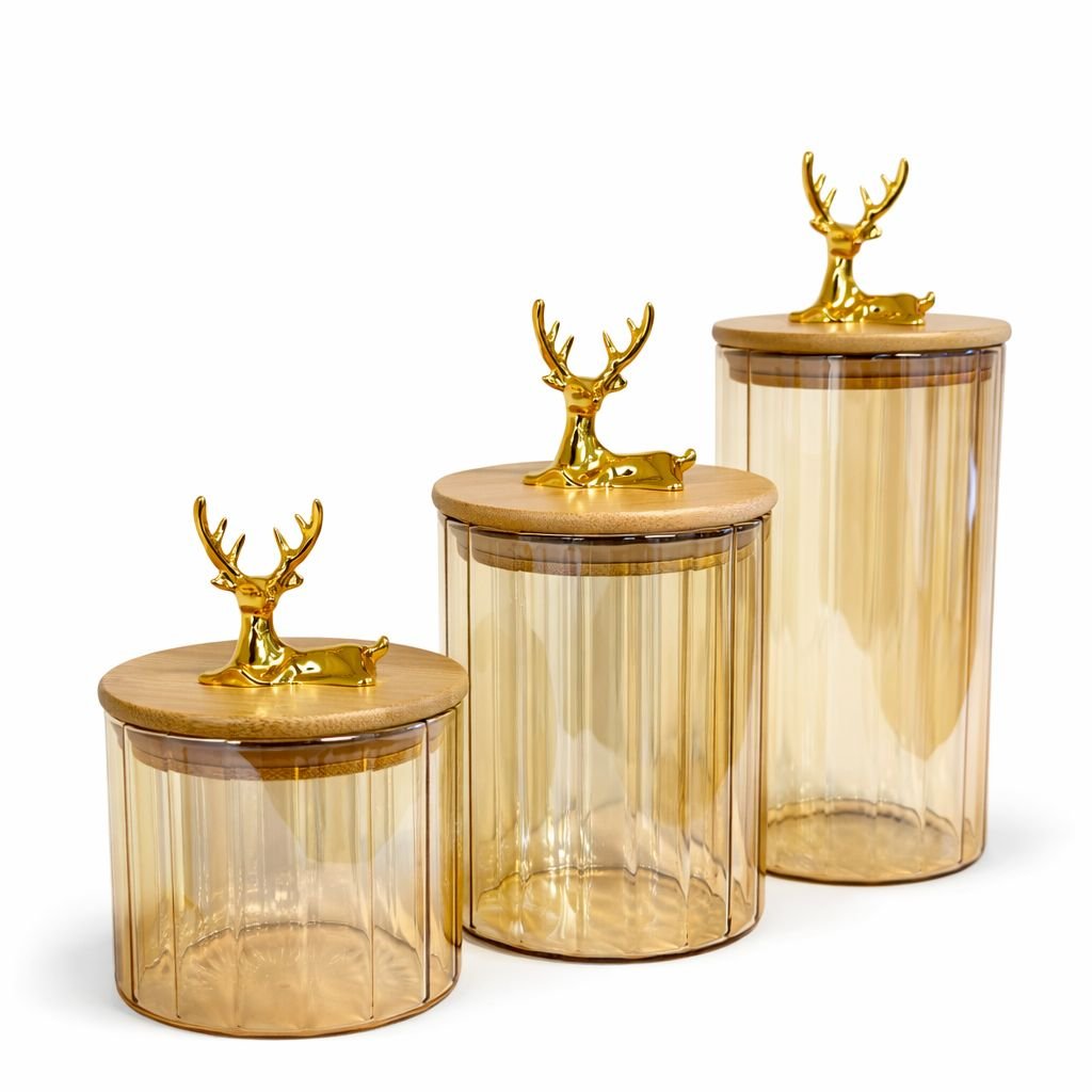 يتميز بتصميم زجاجي شفاف مع أغطية خشبية أنيقة ولمسة ذهبية جذابة تضيف لمسة ديكور راقية لمطبخك.
