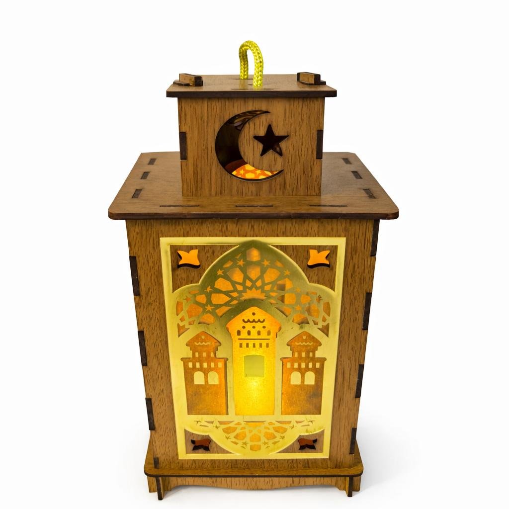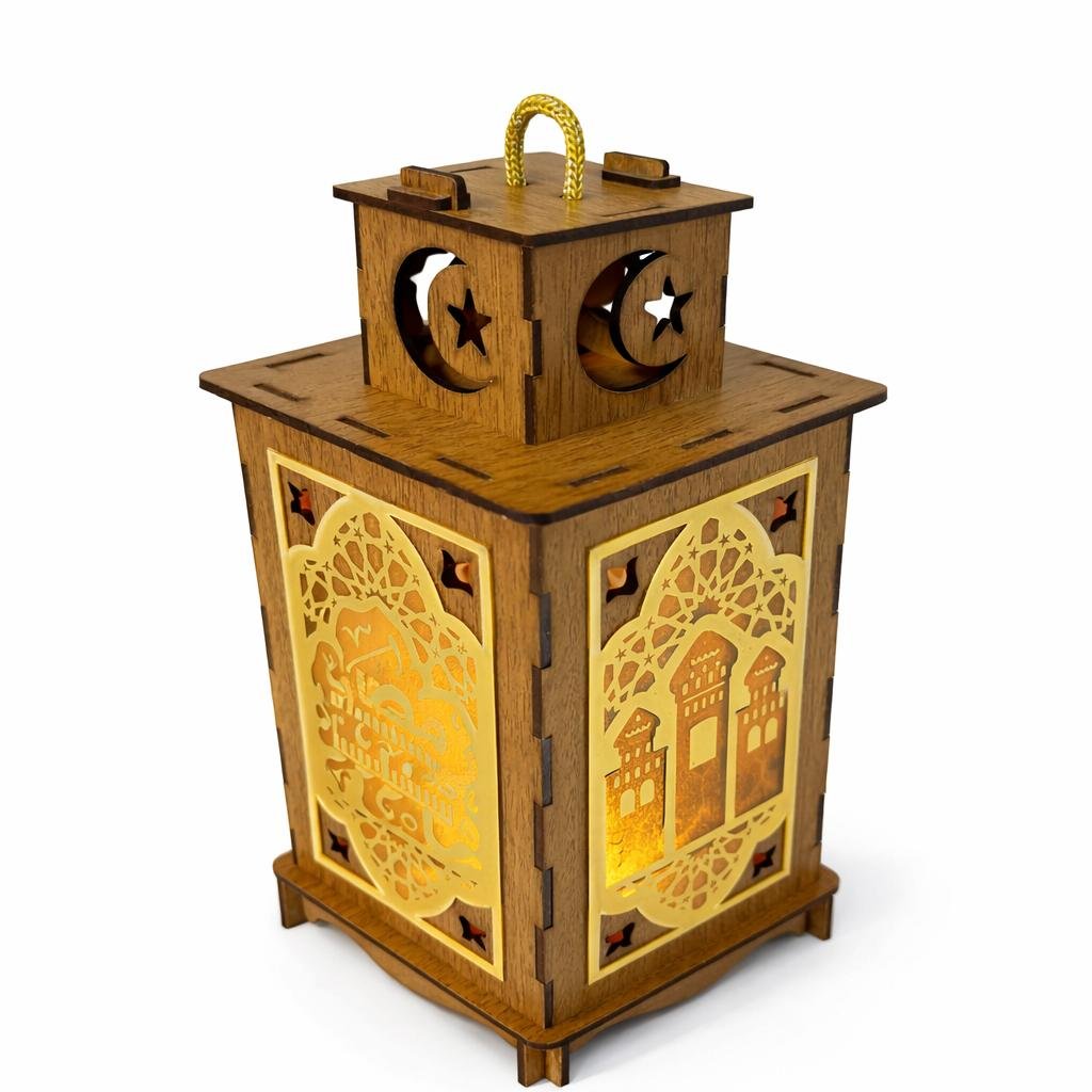 فانوس رمضان خشبي أنيق مزوّد بضوء LED موفّر للطاقة، يعمل على بطارية خارجية، تركي الصنع، مقاس 30 × 15 سم، مثالي للزينة الرمضانية وإضفاء أجواء دافئة في المنزل.