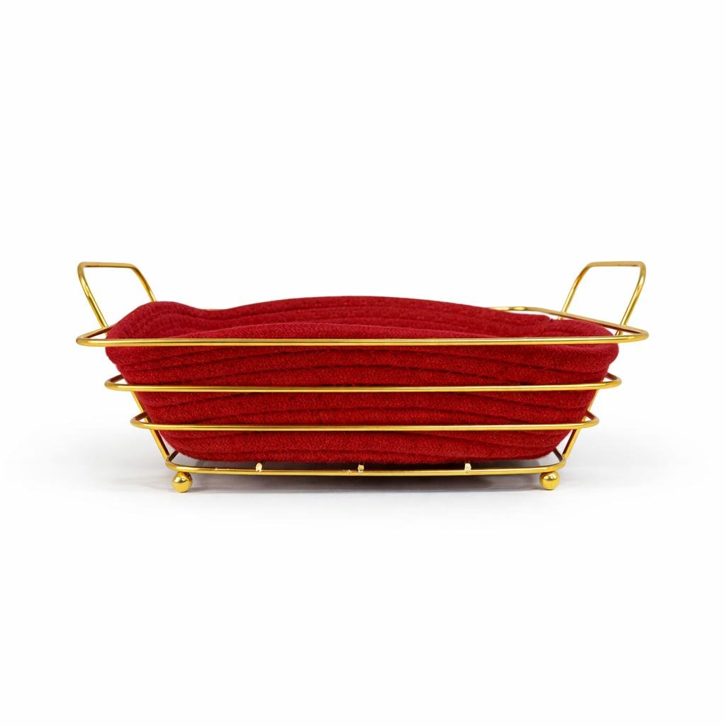 سلة تقديم أنيقة تجمع بين العملية والجمال، مصنوعة من هيكل معدني متين باللون الذهبي مع بطانة قماشية ناعمة قابلة للإزالة باللون الأحمر.