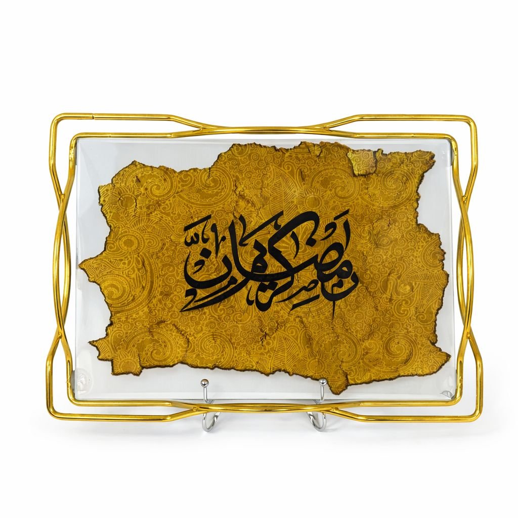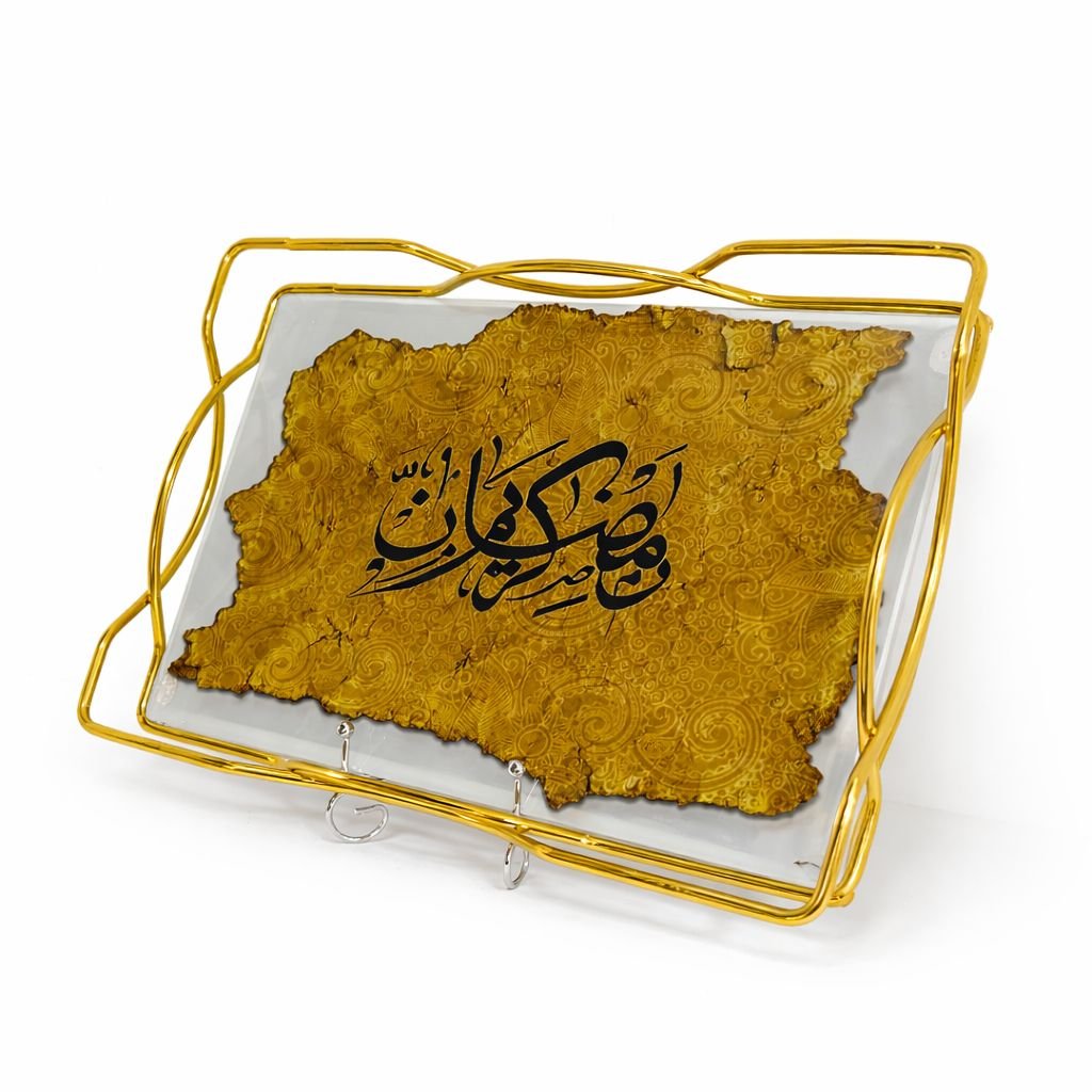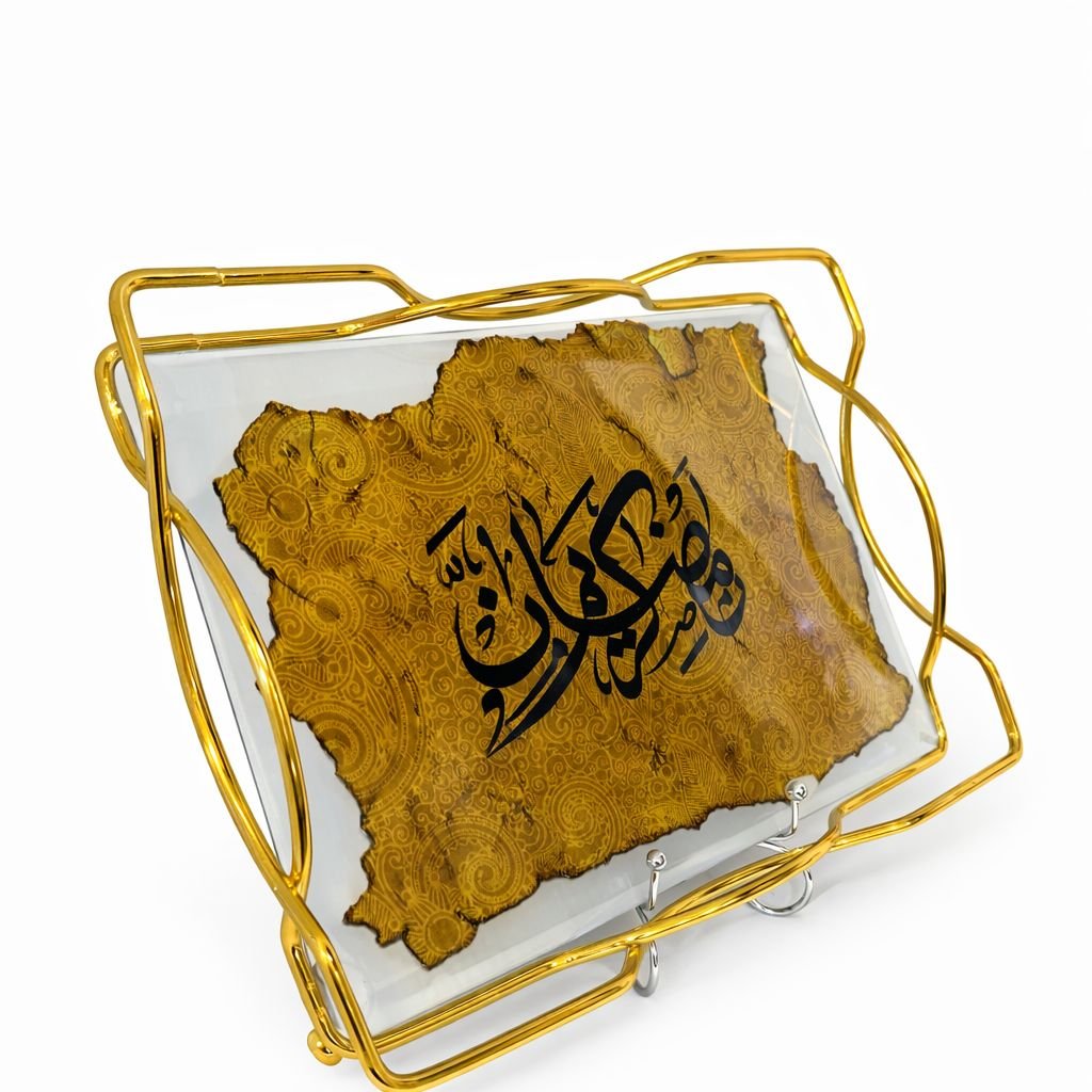 صينية تقديم فاخرة مصنوعة من الزجاج الشفاف، تتوسطها لوحة فنية ذهبية مزخرفة تحمل كلمة ‘رمضان كريم’ بخط عربي أنيق، ومحاطة بإطار معدني باللون الذهبي بتصميم عصري مميز.