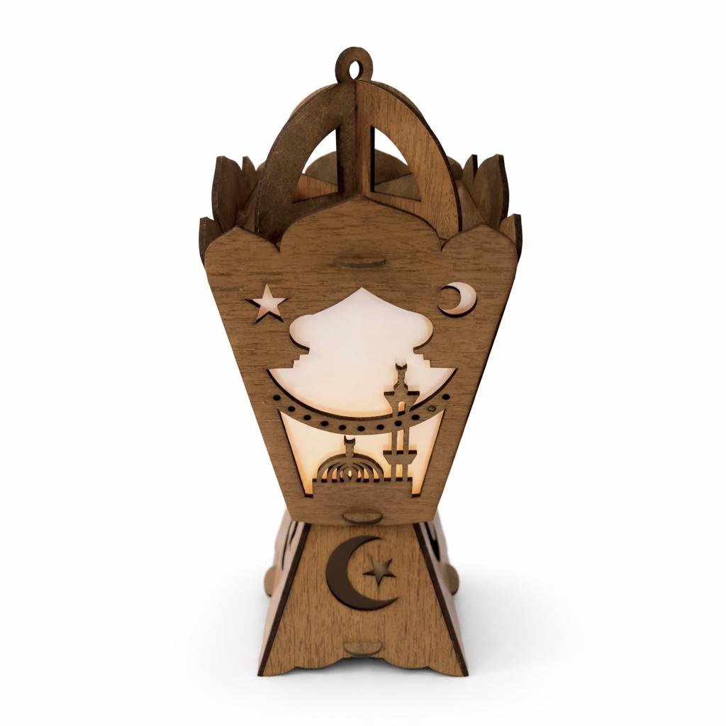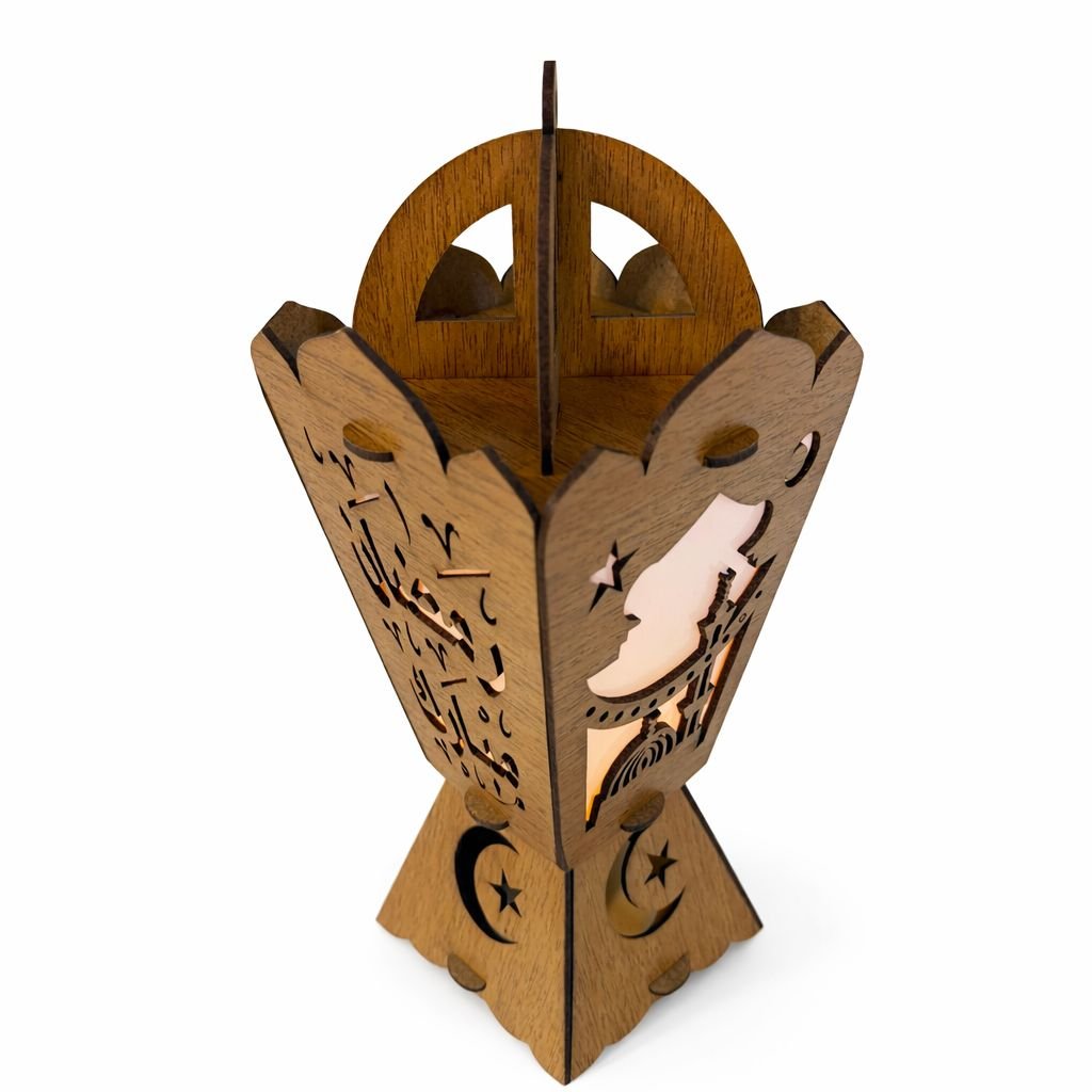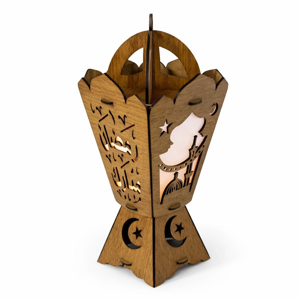 فانوس رمضان خشبي أنيق مزوّد بضوء LED موفّر للطاقة، يعمل على بطارية خارجية، تركي الصنع، مقاس 30 × 15 سم، مثالي للزينة الرمضانية وإضفاء أجواء دافئة في المنزل.